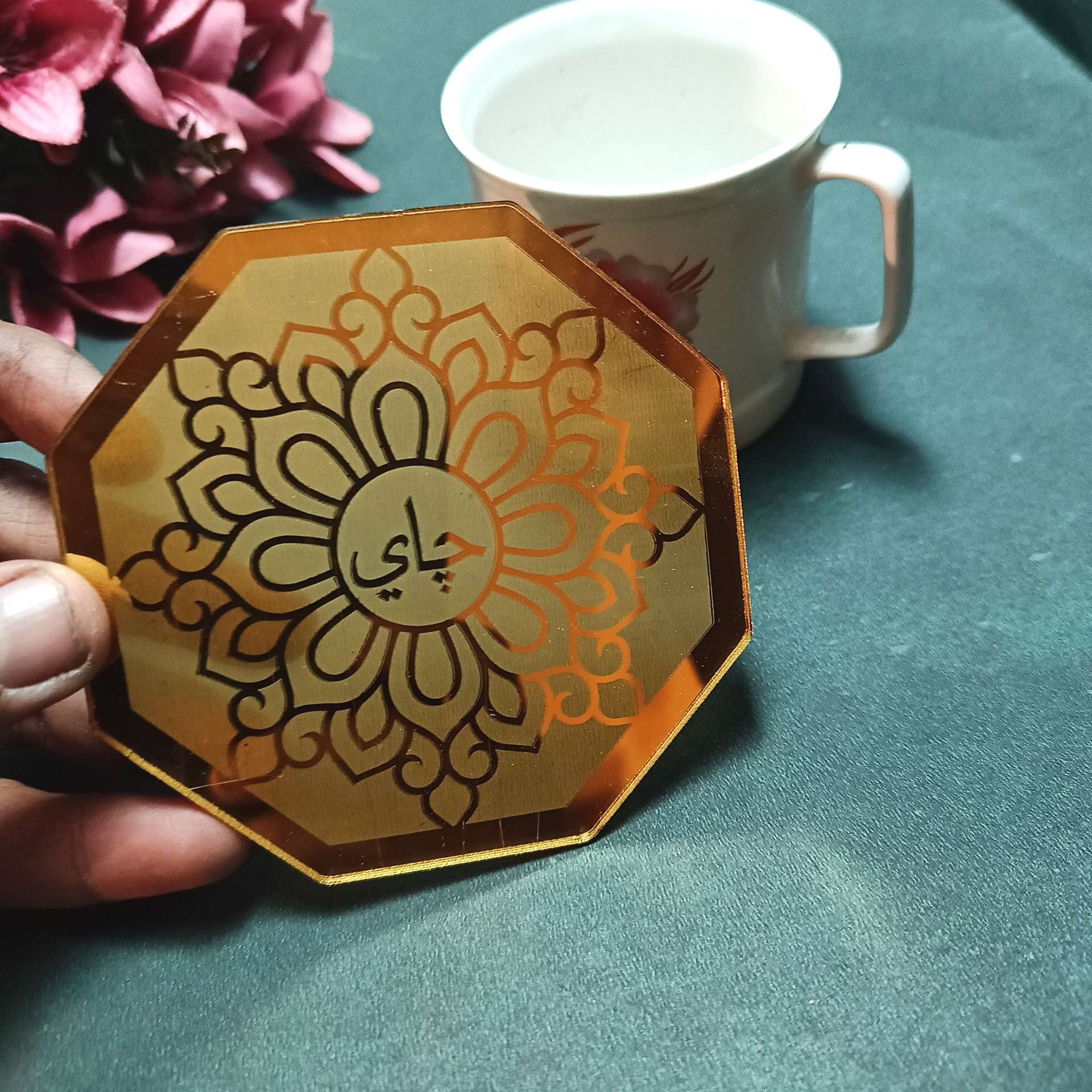 - Complete set: Comes as a set of four coasters with ARABIC TEA LETTER ENGRAVED Buy two sets if you need eight coasters