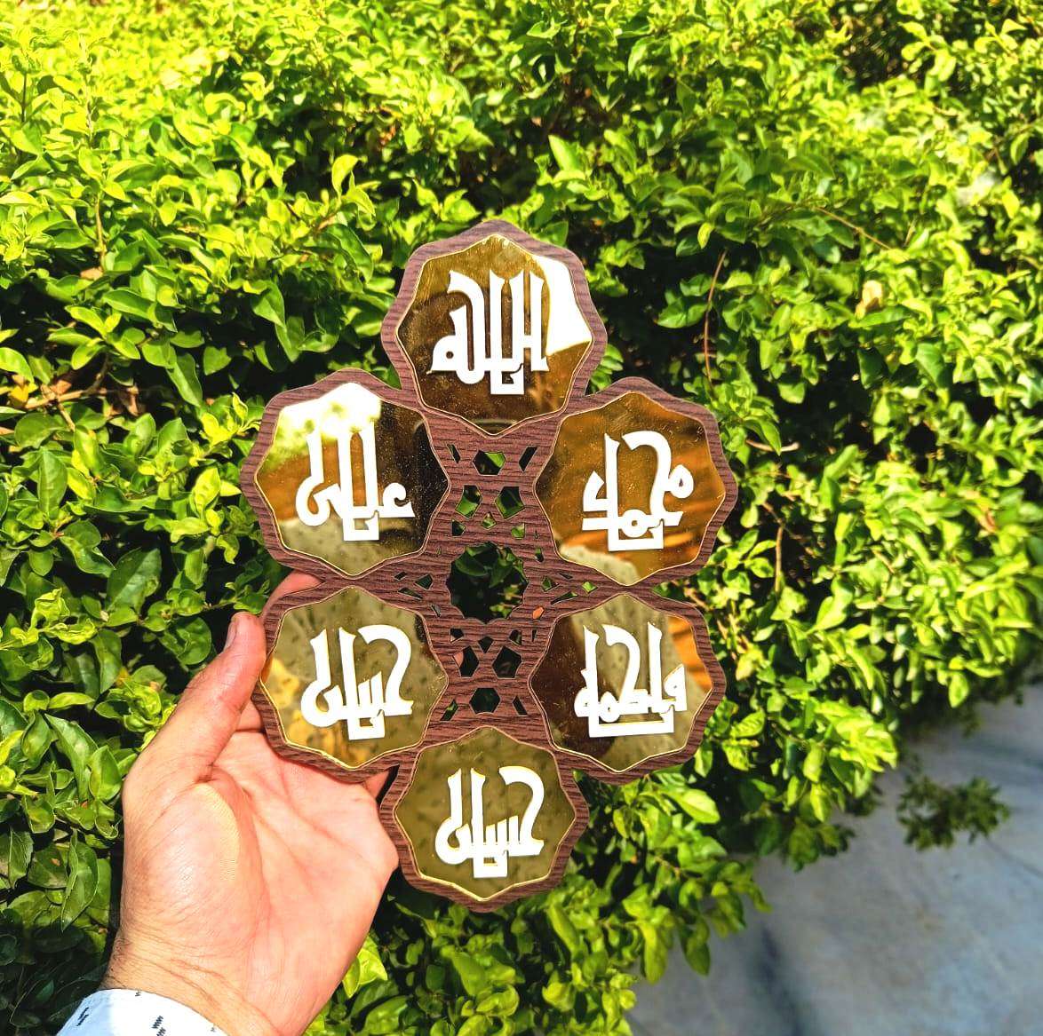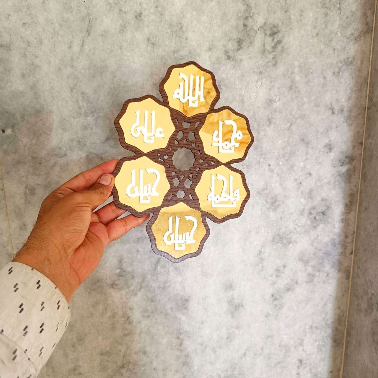 Saifee Burhani art presents panjtan pak Religious Frame with golden and brown wall hanging frame for house,home and any shops. It’s made of fine and sharp quality wooden and mdf and featuring gold finish and attractive design, it will surely catch many eye balls. It will blend in with any type of home decor. A beautiful wall hanging frame made with laser cut process product will be a frame that could speak a thousand words they say.